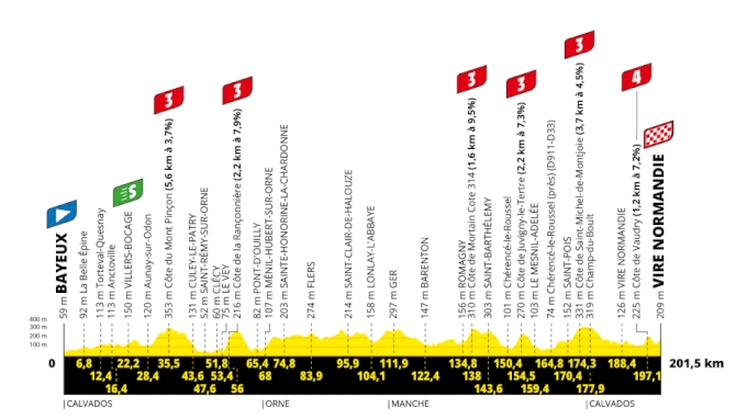 It's the second-longest day of the year at 201.5 kilometers, offering a hilly ride from Bayeux to Vire Normandie.