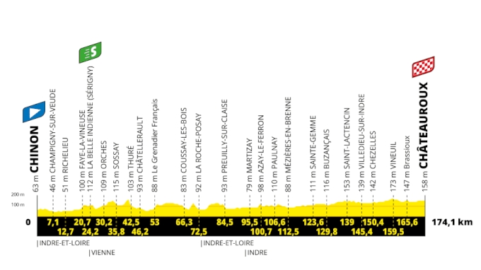 This 174.1-kilometer journey from Chinon to Châteauroux is relatively flat and straightforward and should belong to the sprinters, wind and weather permitting along the way, while the final 5 kilometers will be wide and flat and primed for another fast finish.