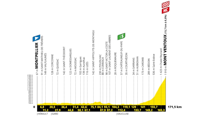 The 171.5-kilometer route from Montpellier to Mont Ventoux features a flat start and is relatively straight forward, while the final 16 kilometers and summit finish are what will be talked about when recounting the day.