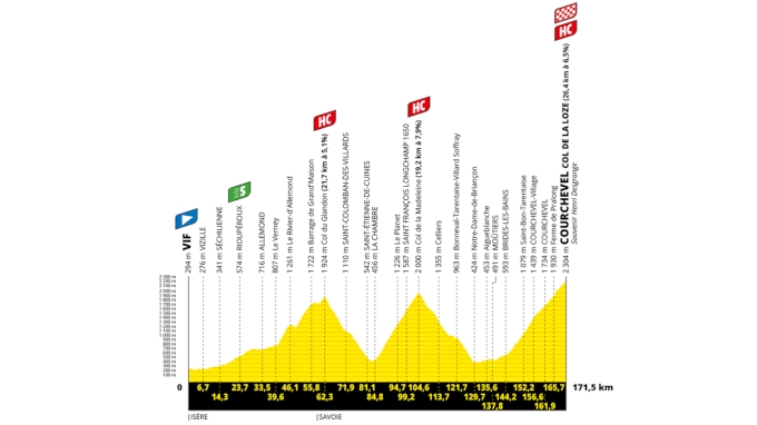 The highest classification for climbs is HC (Hors Catégorie), and this stage has three of them (Col du Glandon, Col de la Madeleine and Col de la Loze) along the 171.5-kilometer route from Vif to Col de la Loze.