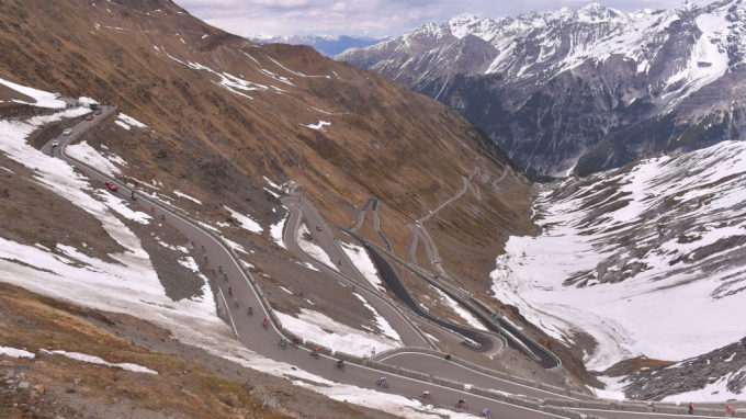 A colossal Alpine stage with 5,400 m vertical altitude in total over four climbs. The route starts uphill on Passo Campo Carlo Magno. The highest point of this year's Giro is reached on the Stelvio in the Alps with riders facing a gruelling 2,758m climb.
